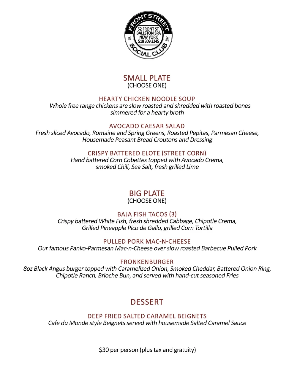 Menus The Front Street Social Club